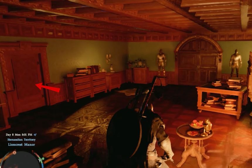 Puoi trovare la collana del Santo all’interno di una cassa forte nell’Hillside Manor, appena a sud-est del Castello di Hernand. Quando raggiungi il maniero, vai sul lato sinistro dell’ingresso principale e sali sul muro per entrare da una finestra. Apri quella finestra e sali dentro per trovare la cassaforte sul lato opposto della stanza, lontano dalla porta.