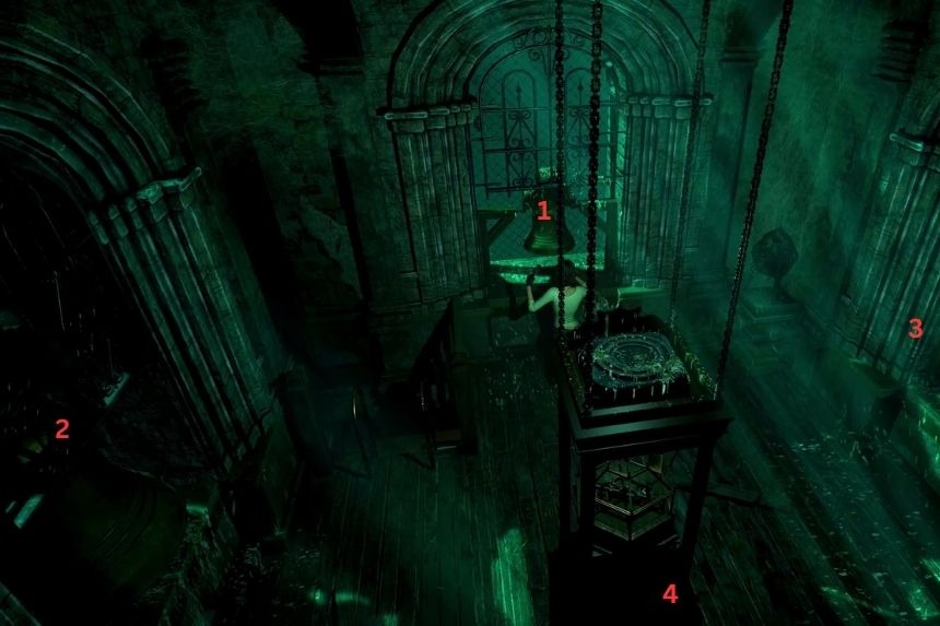 Troverai il puzzle all’ultimo piano del Campanile del Convento. Usa il martello e leggi la targa. Qui riceverai i suggerimenti per sbloccare il puzzle. I suggerimenti ti diranno di colpire le campane usando il martello in un ordine specifico. Per prima cosa, colpisci la seconda campana più piccola, poi quella più grande. Poi la campana più piccola ed infine la seconda campana più grande. Questo romperà il vetro e otterrai il fucile.