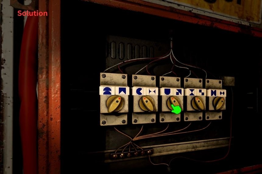 All’interno della prigione del Convento usa le pinze per aprire i fili della scatola dei fusibili. Ora, ruota i quadranti nell’ordine specifico, da sinistra a destra: Puntando a destra > Puntando a sinistra > Puntando a sinistra > Puntando a sinistra > Puntando a destra.