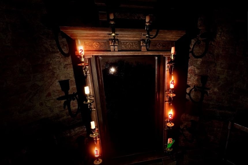 Nel Museo della Tortura del Convento troverai uno specchio. Usa l’accendino per accendere le candele sullo specchio come mostrato nell’immagine sopra. Questo aprirà il teletrasporto all’inferno. Otterrai gli indizi del puzzle guardando l’immagine di una donna che si guarda allo specchio. L’immagine può essere trovata sul muro della musica.