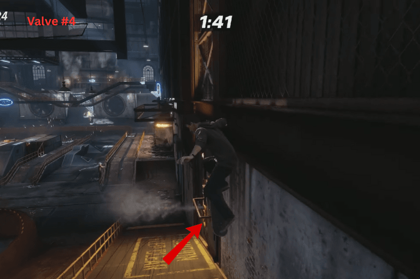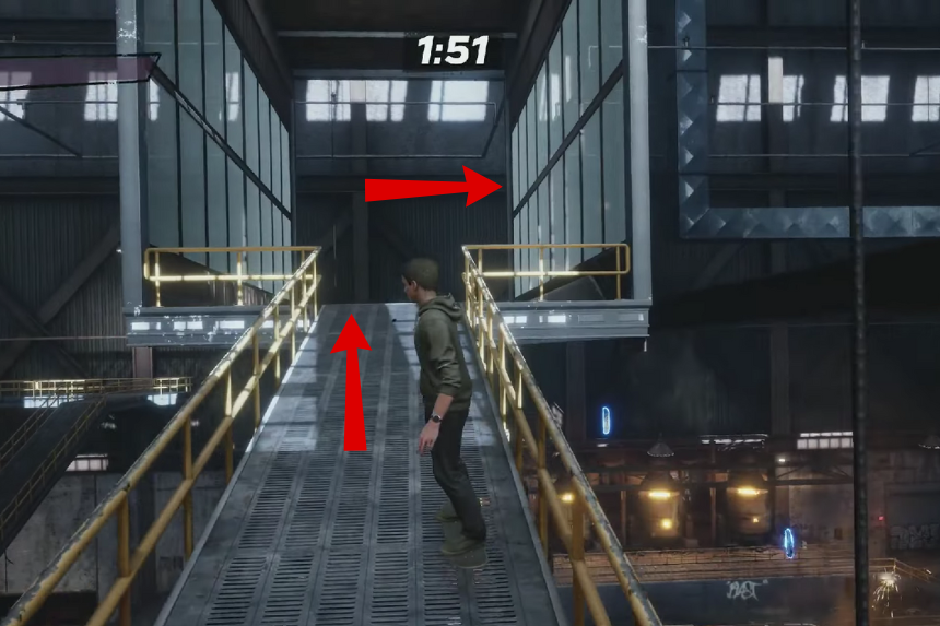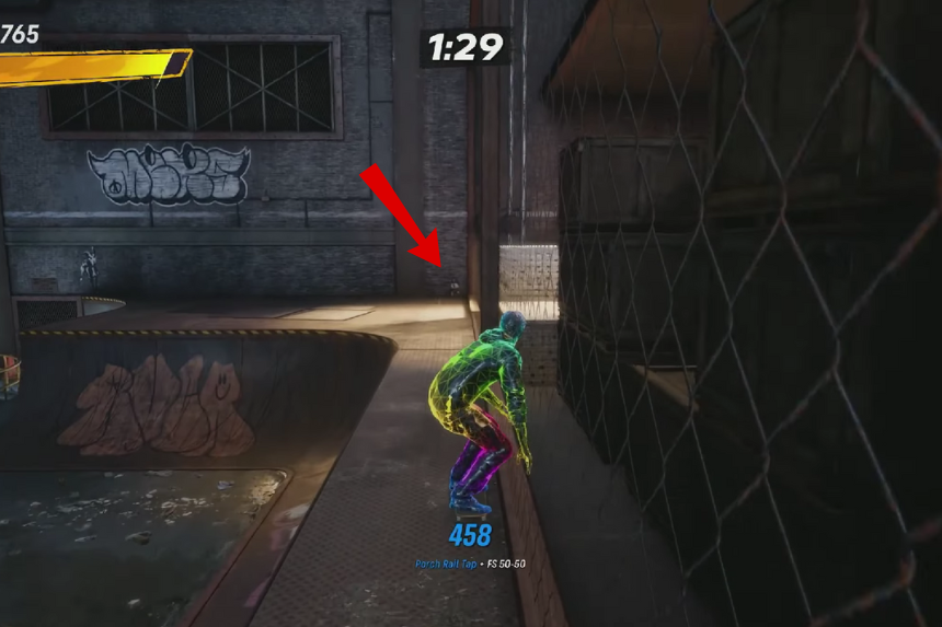 Proprio all’inizio della corsa, gira a destra e usa la rampa per saltare sulla passerella. Una volta che sei sulla passerella, percorrila fino alla fine finché non raggiungi una stanza con due finestre di vetro. Il nastro segreto è sulla ringhiera appena fuori dalla finestra di destra. Fai il salto con precisione, mantieni l’equilibrio e pattina per afferrare il nastro.