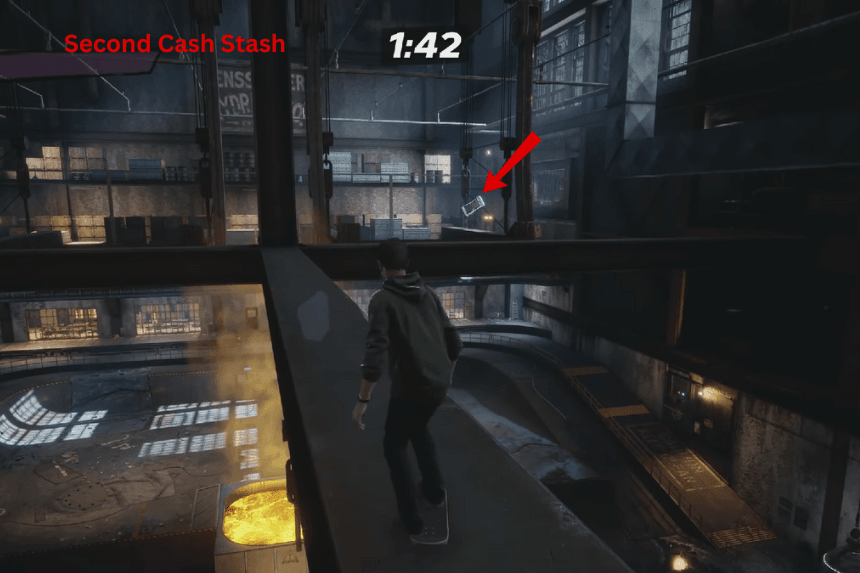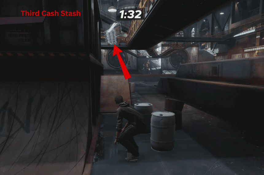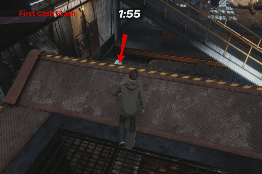 - Terza scorta di contanti: inizia saltando sulle passerelle usando le rampe all’inizio. Segui la passerella fino alla stanza con le pareti di vetro alla fine. Da qui dovrai fare due salti complicati: il primo, salta sulla stretta ringhiera davanti a te, poi fai un secondo salto per raggiungere l’area dove ti aspetta l’ultimo Skaterbucks.