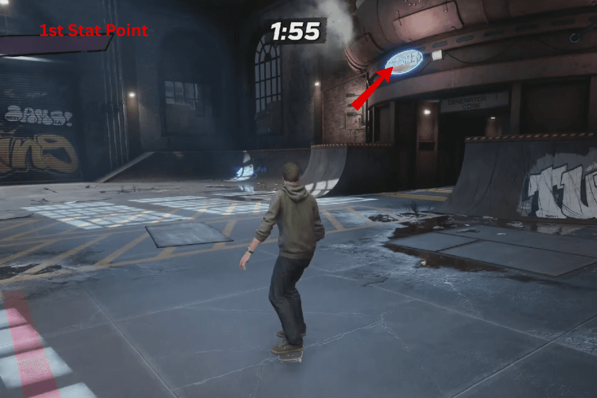 Il secondo punto statistico è al centro della mappa. Per ottenerlo, pattina lungo la grande rampa all’inizio, salta sopra l’half-pipe e poi usa la rampa al centro per raggiungerlo.