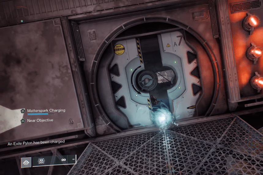 Continua lungo il percorso, caricando ogni nodo quando lo incontri. Dopo che tutti e tre saranno stati accesi e avrete finito la sezione di attraversamento rapido, vi ritroverete in una piccola stanza. Controlla il mucchio di detriti all’interno e interagisci con esso per afferrare il primo pezzo dell’arma Graviton Spike.