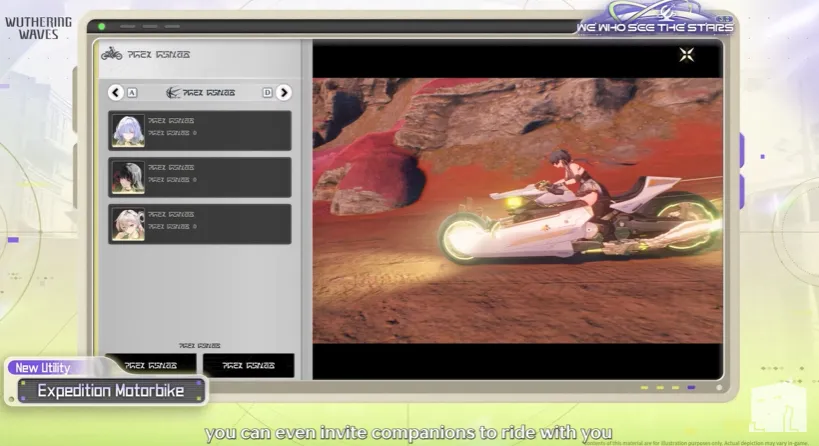 Durante il pilota automatico, i giocatori possono anche scegliere di entrare “Modalità cinematografica” dove la telecamera si regola automaticamente e si muove dinamicamente. Inoltre, i Rover possono invitare altri Resonator a viaggiare con loro sulla Moto da Spedizione, una piccola caratteristica molto pratica.
