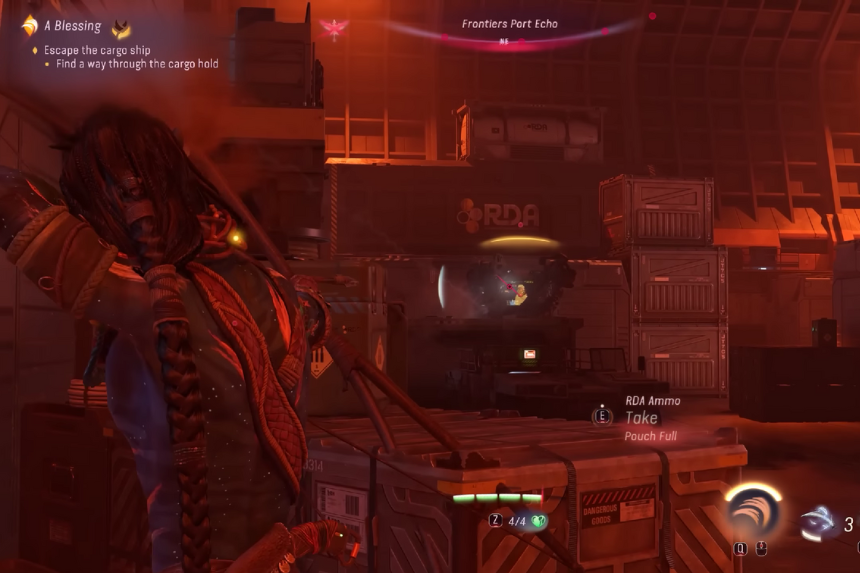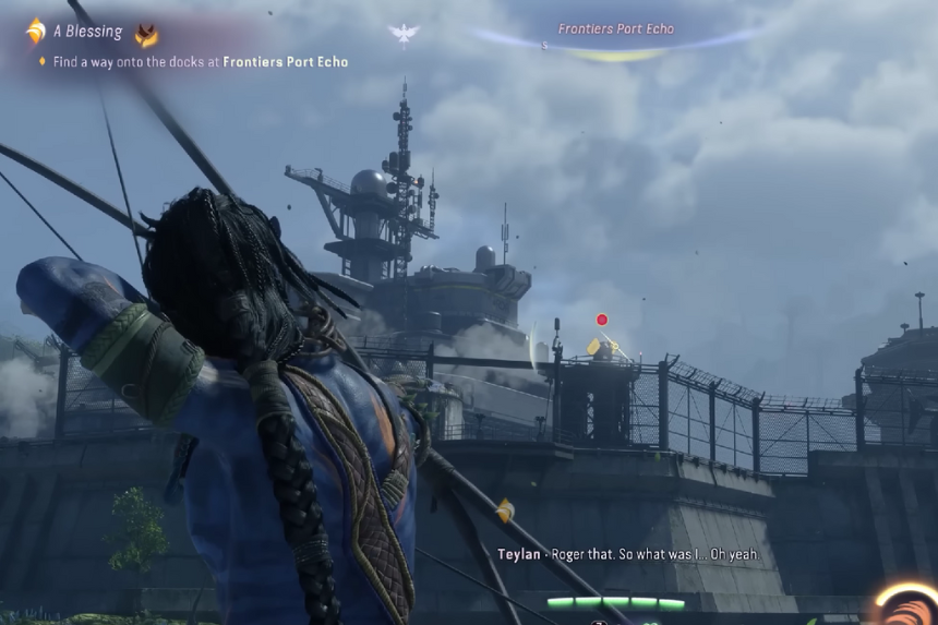Il tuo prossimo obiettivo è raggiungere il molo di Frontiers Port Echo. Evoca nuovamente il tuo Ikran e segui l’indicatore giallo. Quando arrivi, fai atterrare il tuo Ikran vicino al molo. Sii cauto qui: questa è una struttura RDA, quindi i nemici sono ovunque e la sicurezza è rigorosa.