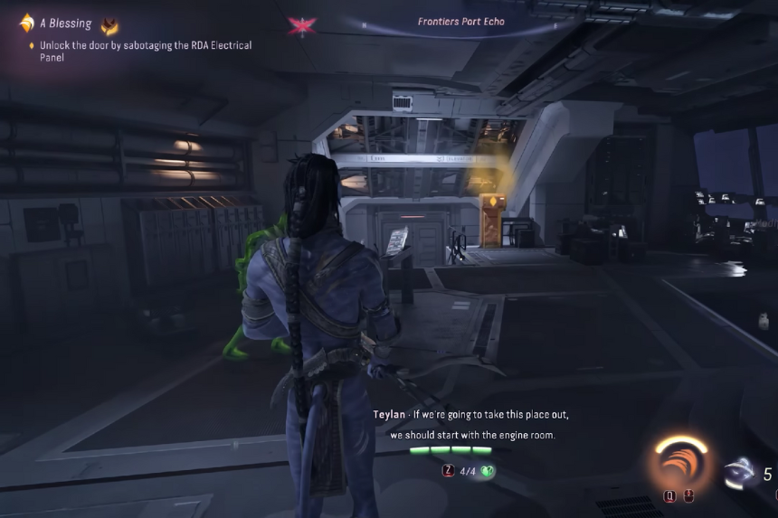 All’interno della nave, continua a seguire l’indicatore giallo per individuare Teylan. Alla fine, verrà riprodotto un breve filmato che mostra la tua riunione. Il tuo primo compito è sbloccare una porta disabilitando un pannello elettrico RDA usando il coltello. Una volta aperta la porta, fatti strada attraverso la nave fino alla sala macchine. Fate attenzione alle guardie lungo la strada.