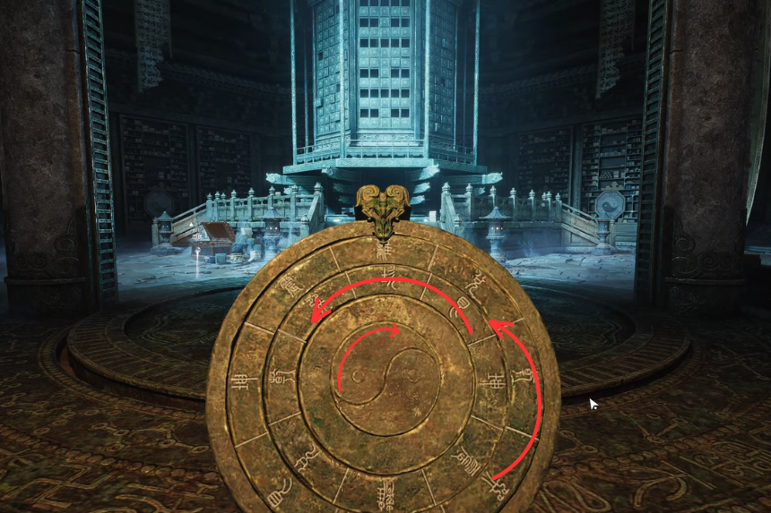 Una volta raggiunta la camera sotterranea, sali i gradini e controlla il cadavere seduto di fronte a te. Interagendo con esso otterrai l’indizio degli Otto trigrammi stracciati. Dopodiché girati e noterai una grande porta sigillata con una piattaforma Bagua Wheel davanti ad essa. Per aprire la porta, ruota i due anelli sul quadrante e abbina i simboli in base all’indizio che hai appena raccolto. Quando i simboli saranno allineati correttamente, la porta si sbloccherà. Entra e attiva la Tomba dell’Eroe per continuare.