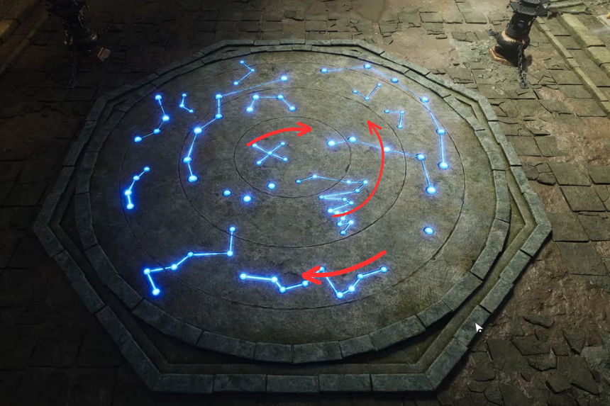 Entra nel recinto e affronterai il terzo puzzle della costellazione. Questo è un po’ più impegnativo perché girare un anello muove anche gli altri. Un buon approccio è iniziare con l’anello più esterno, poiché non è influenzato dagli anelli interni. Una volta impostato, puoi regolare gli anelli interni più facilmente.
