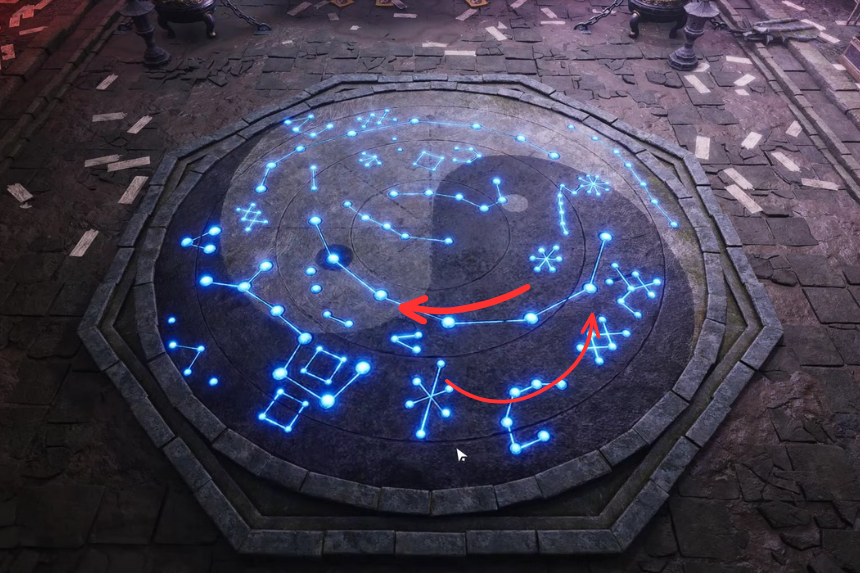Fatto ciò, entrate nel recinto. Ti imbatterai in un altro puzzle di costellazioni. Usa la piattaforma Bagua della stella polare per ruotare gli anelli finché le costellazioni non si allineano e si collegano. Dopo averlo risolto, ti verrà mostrato un altro ricordo del passato. Questa volta ti verrà chiesto di scegliere tra “Cattivo” o “Buono”. Proprio come prima, la tua scelta non influisce sul risultato, quindi scegli quello che preferisci.