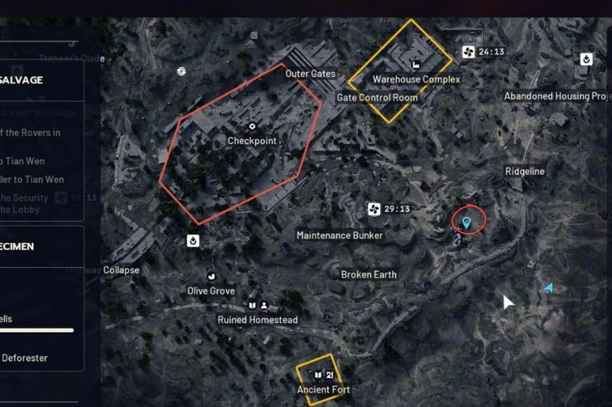 Innanzitutto, dovrai ottenere due ARC Powercell, che sono oggetti facili da acquisire. Puoi ottenerlo facilmente distruggendo ARC come Vespe o Boccini. Quindi, ciò che dovrai fare è andare sulla mappa del Cancello Blu e dirigersi verso la posizione esatta contrassegnata nell’immagine sopra, che è a est del Bunker di manutenzione.