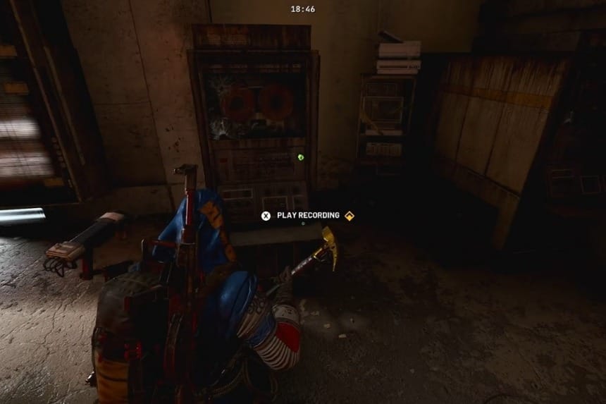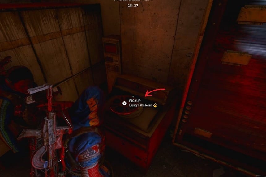 Una volta aperta la porta, vai in fondo alla stanza per trovare l’enorme schermo e alla sua destra troverai una specie di computer. Interagisci e premi “Riproduci registrazione”. Successivamente, guarda a sinistra dello schermo e troverai un contenitore. Interagisci con esso per ottenere la Dusty Film Reel.