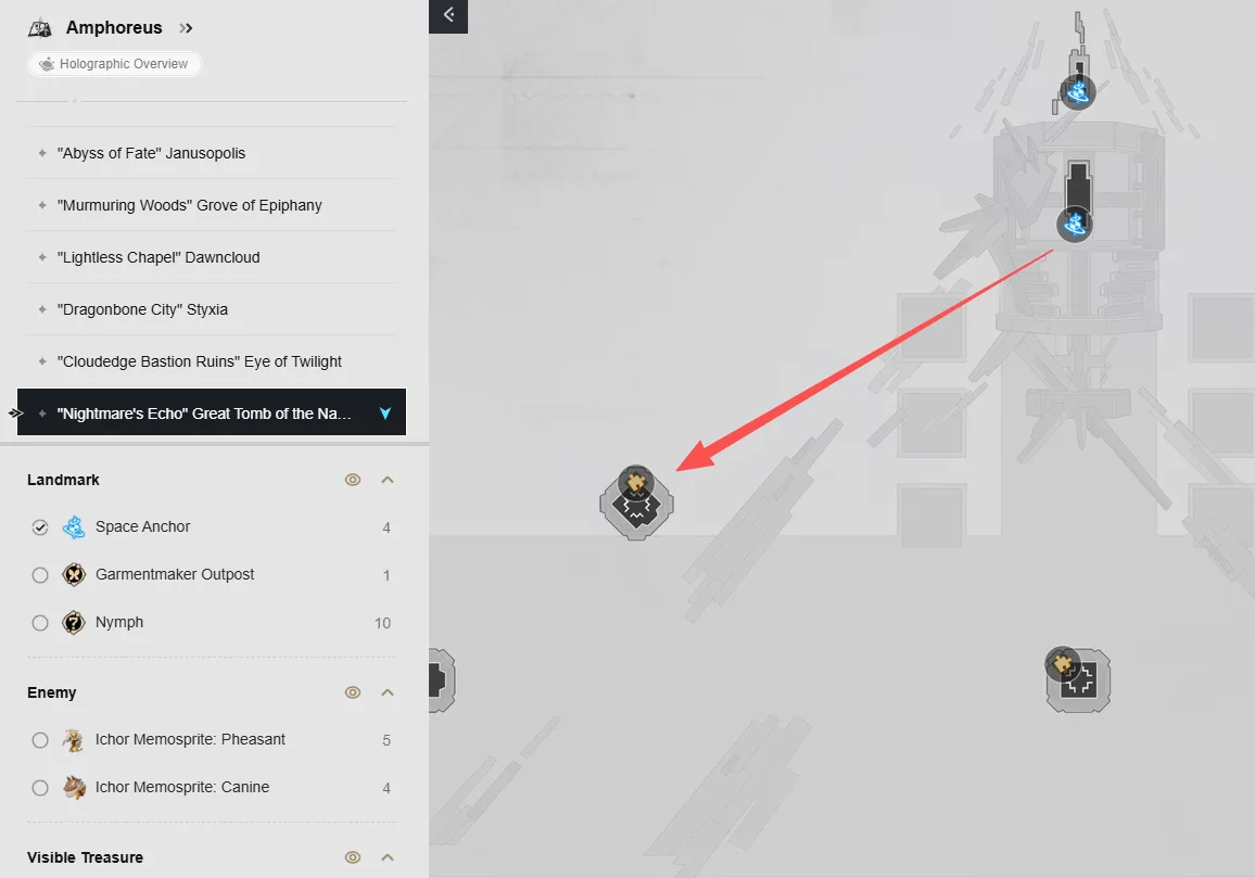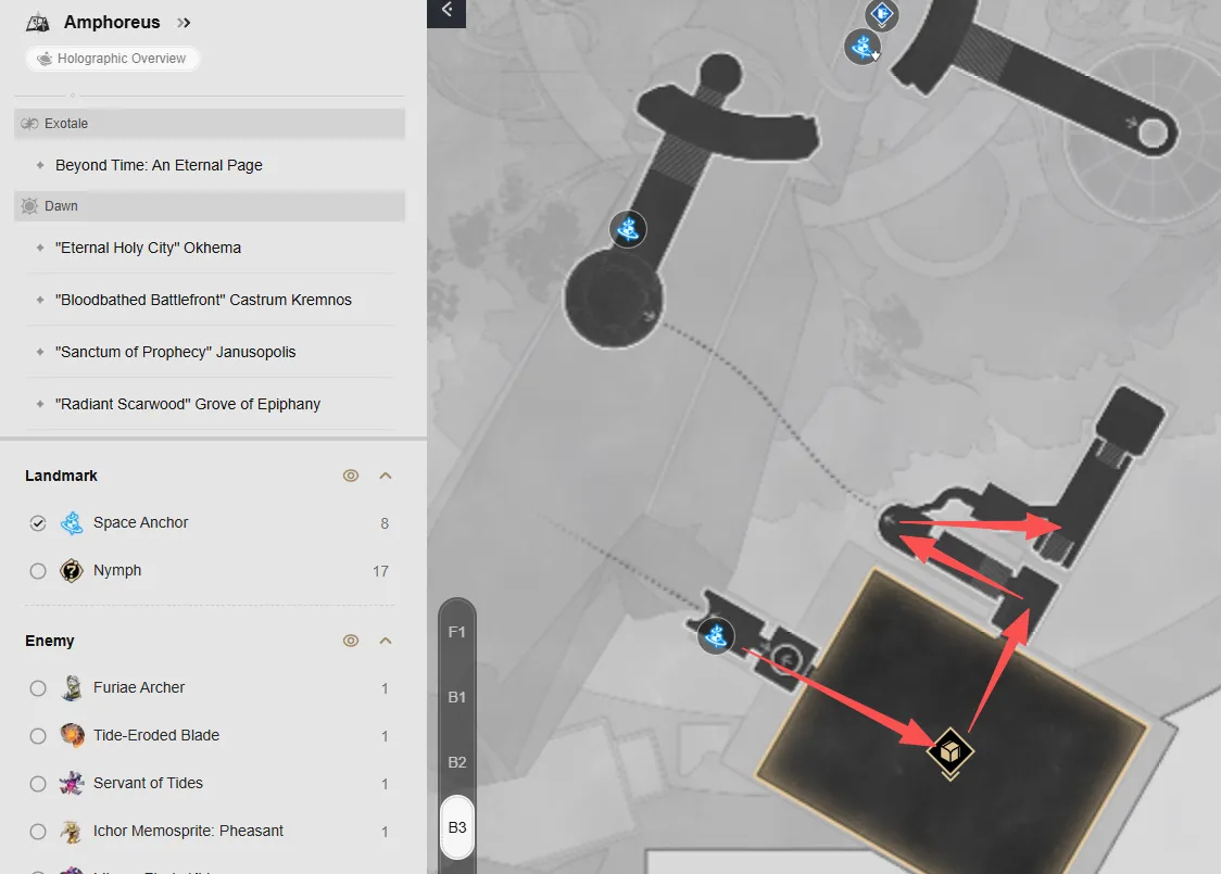 Il terzo capro espiatorio si trova nella parte orientale della mappa. Usa l’ancora spaziale del punto di connessione e dirigiti verso la piattaforma centrale, quindi vai a sinistra.