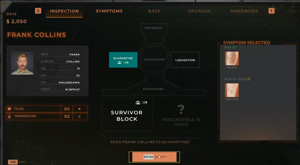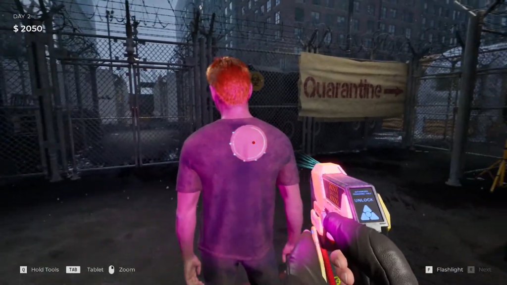 Il gioco richiede che tu lavori al checkpoint e ispezioni i sopravvissuti che vogliono rifugiarsi nel tuo campo. Mentre li controlli, devi utilizzare gli strumenti che ti vengono forniti e decidere se quel sopravvissuto lo è Sicuro o infetto. A seconda del tuo giudizio, puoi intraprendere una delle seguenti azioni: