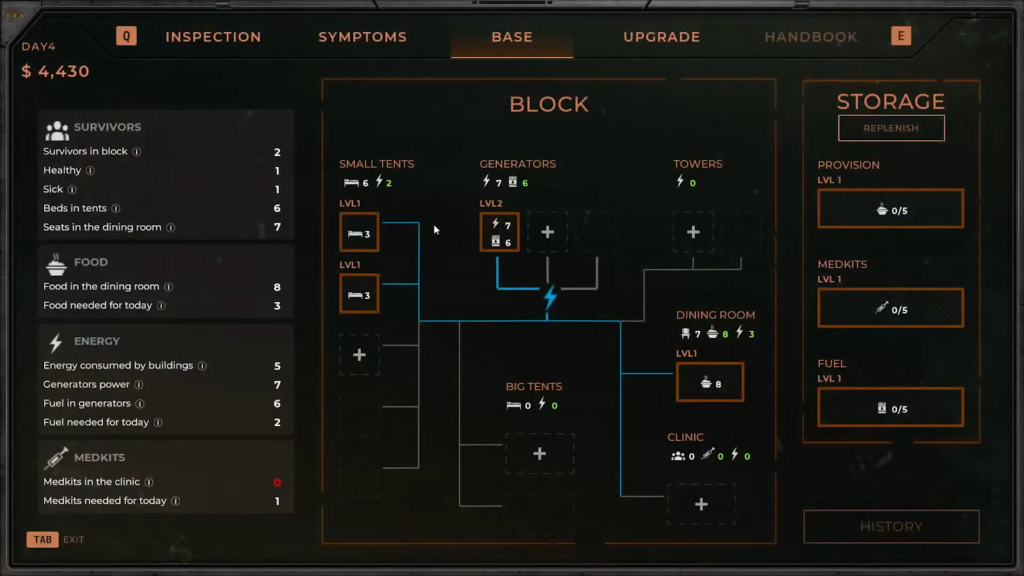 Una volta completato il lavoro al posto di controllo, il tuo compito sarà sviluppare il campo, installare tende con letti e costruire infrastrutture per i sopravvissuti che verranno evacuati entro pochi giorni. Questi sopravvissuti consumano anche le risorse di cui hai bisogno per fare scorta e gestire il tuo inventario, così come i tuoi soldi.